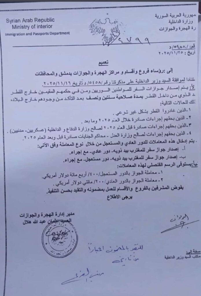 القرار الجديد الصادر عن الهجرة والجوازات السورية لا يعتبر تسهيلًا كما يُروّج له، بل خطوة تُقلّص من مدة جواز السفر وتضاعف الأعباء على السوريين، في وقت يعاني فيه الملايين من أوضاع اقتصادية صعبة، وصعوبات كبيرة في مراجعة السفارات، ومصاريف متزايدة للسفر والوثائق الرسمية.